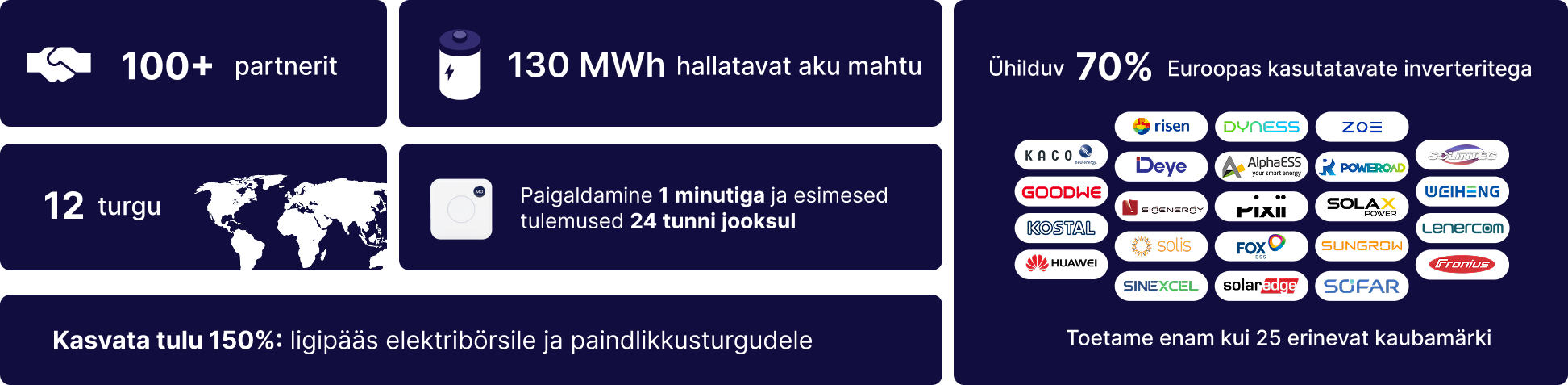 MarkeDroid sobib kokku suure hulga tootjate riistvaraga. Sa ei pea oma olemasolevaid päikesepaneele, akut või soojuspumpa välja vahetama – me paneme need ühtse meeskonnana tööle.